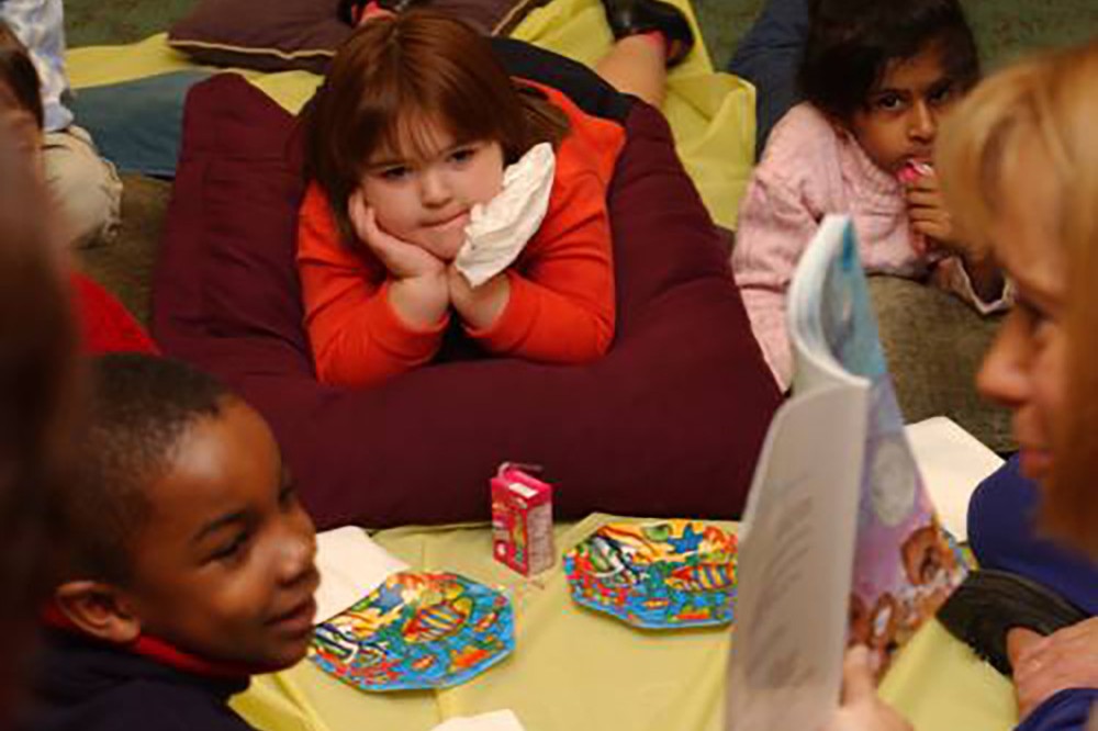 Wallace library staff members Jodi Sidlauskas (right) and Joan Naturale read stories to Margaret's House kindergarten class, Nov. 19, in The Idea Factory on the library's first floor. -