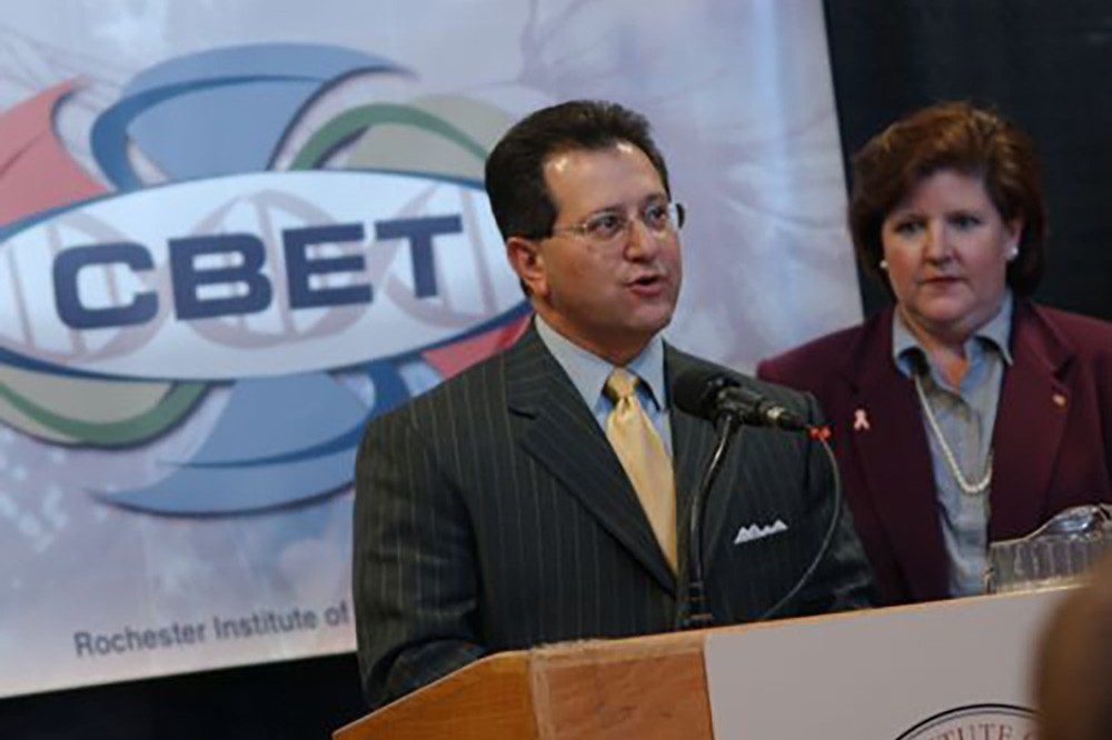 Assemblyman Joseph Morelle and Assemblymember Susan John announce the New York state Assembly1s support of RIT's Center for Biotechnology Education and Training (CBET) with $4 million in funding, Oct. 8. This brings the total state funding to date to $8 million, including $4 million from the state Senate1s Gen*NY*sis fund announced last month by Sen. Jim Alesi. The $8 million will allow RIT to begin the design process immediately for a 46,000-square-foot facility to house CBET. -
