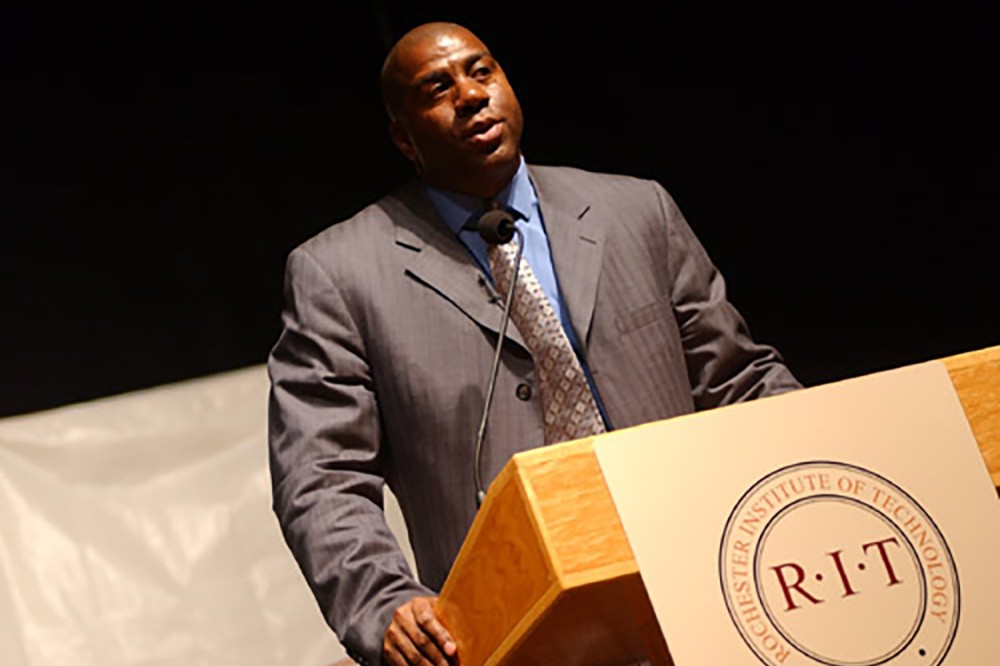 Earvin "Magic" Johnson speaks to RIT students, alumni and parents in Clark Gymnasium, Oct. 12, as part of Brick City Festival and Reunion 2002. -
