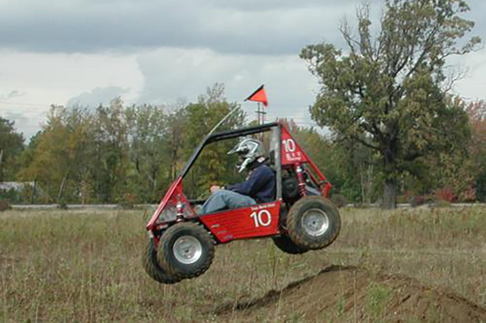 Mini-Baja team member Sam Rogers gets in some last-minute practice driving beore the team leaves for Pretoria. -
