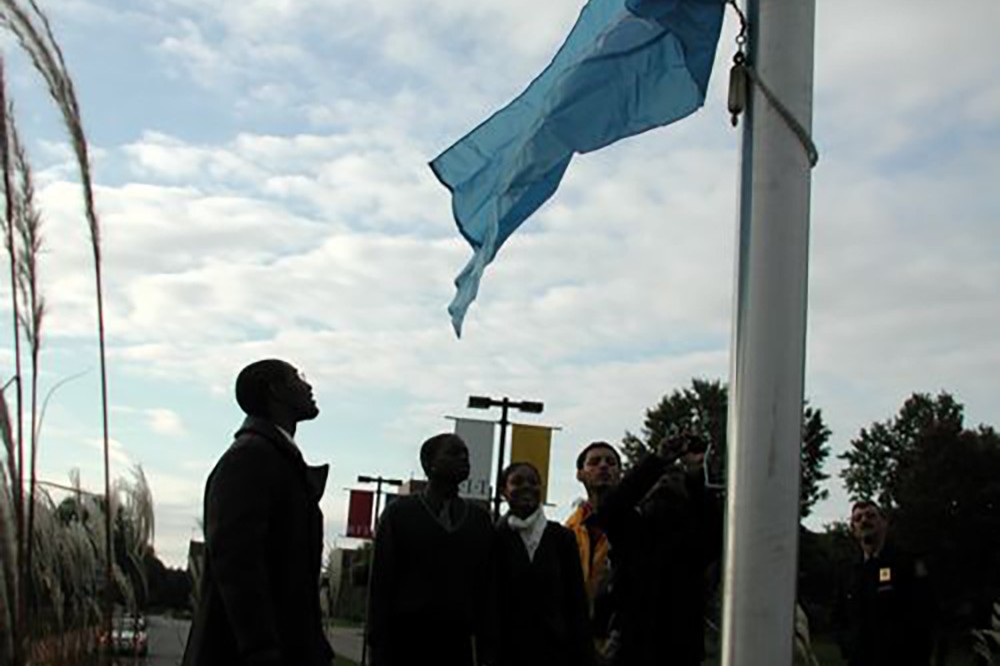 Members of the Caribbean Students Association raise the United Nations flag in the traffic circle , Oct. 24, in observance of U.N. day. Howell Geib, executive director of the U.N. Association of Rochester, was on hand for the flag-raising. -