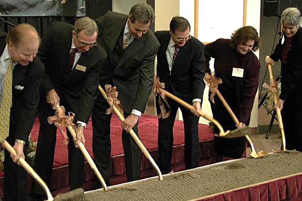 Wolfgang Pfizenmaier (fourth from the left), CEO of Heidelberg Digital, joins RIT leaders to celebrate the start of construction on the Heidelberg Web Press Laboratory. The facility will house a multi-million dollar web press that the company is providing to RIT. Joining him at a ceremonial groundbreaking were (left to right) William Buckingham, RIT Board of Trustees chairman; William Sheeran, Center for Integrated Manufacturing Studies director; Albert Simone, RIT president; Amy Pike, RIT alumna; and Joan Stone, College of Imaging Arts and Sciences dean. -