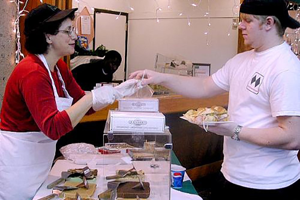 Rhonda Jones of K&B Fudge Company hands a free sample of mint chocolate fudge to first-year engineering student Billy Pittenger, Dec. 12, in the Ritskellar. Free samples of fudge, milkshakes and European pastries are available throughout the day. -