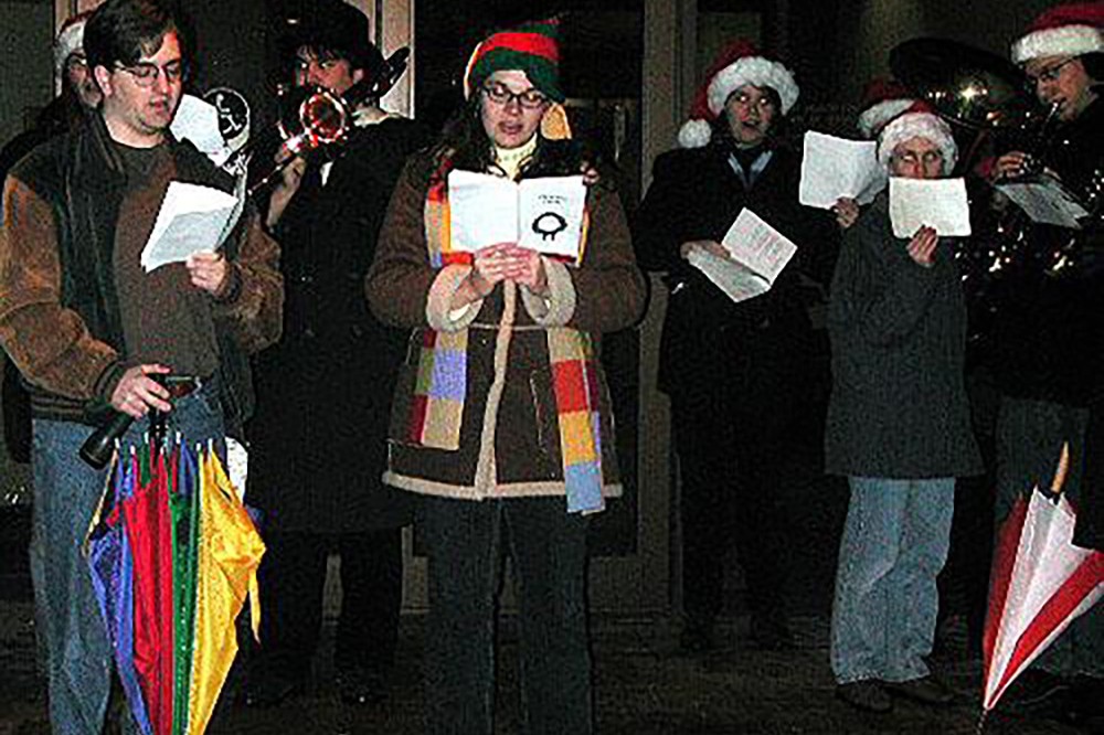RIT students sing Christmas carols with the RIT brass quartet outside the Student Life Center, Dec. 17. -