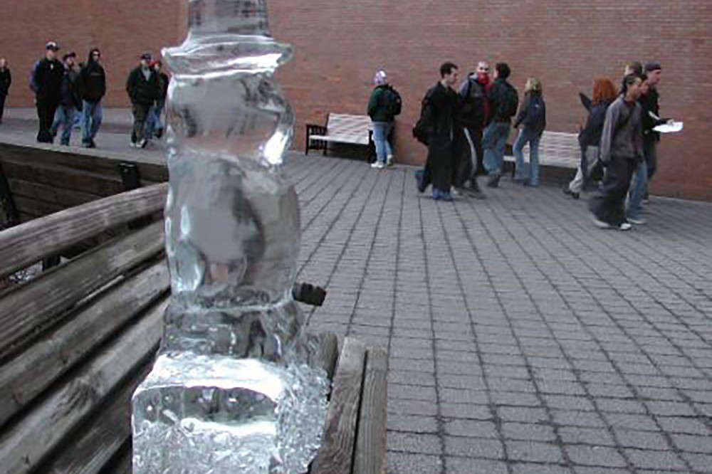 A snowman ice sculpture slowly melts outside the George Eastman building as students walk to class, Dec. 18. -