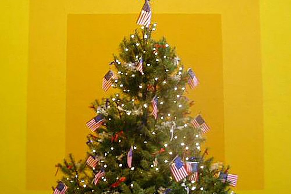 A Christmas tree decorated with United States flags graces the lobby of RIT's George Eastman building. -