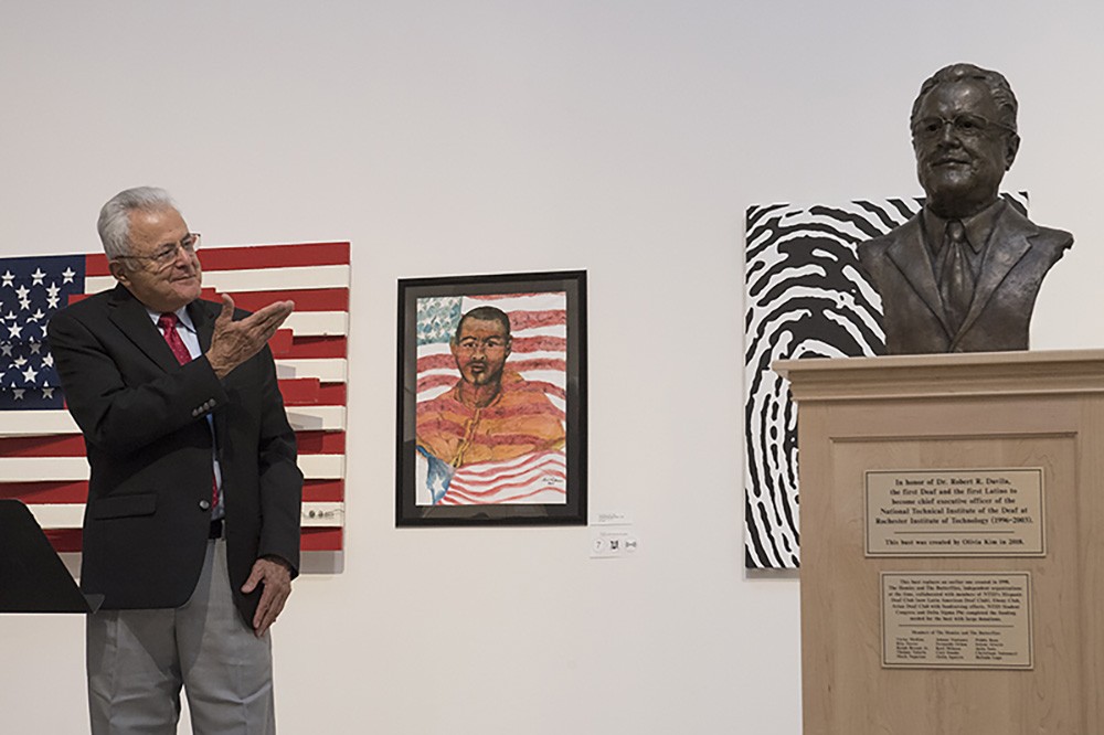 Dr. Robert Davila, NTID’s first deaf vice president, was honored at an unveiling ceremony of a bust of his likeness created by Rochester artist Olivia Kim. The event, which took place in the Dyer Arts Center in LBJ Hall, was part of NTID’s Latin Deaf Week activities. Davila, who led NTID from 1996 - 2003, oversaw the construction of the Dyer Arts Center during his time at the college.