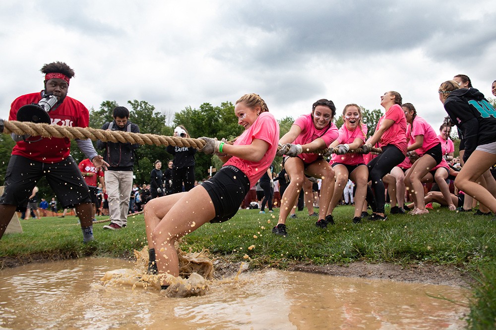 Zeta Tau Alpha sorority and Phi Kappa Psi fraternity hosted the annual Mud Tug fundraiser featuring tug-of-war competitions over mud pits. About 2,000 students participated in the event to raise money for Hillside Family of Agencies. -
