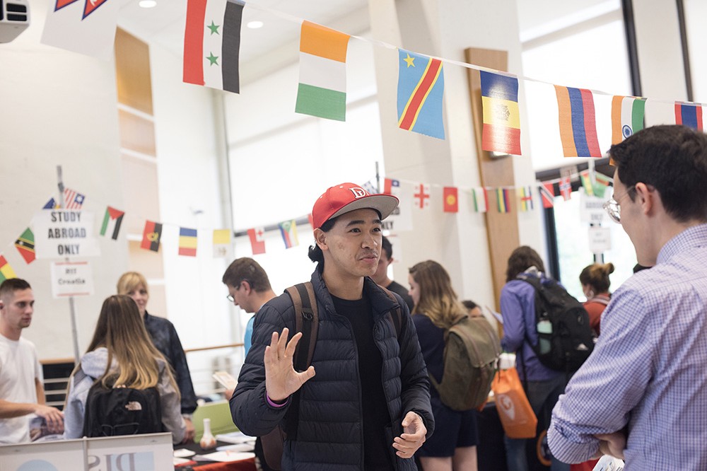 James Le, a first-year computer science graduate student from Vietnam, talks to a representative about opportunities in Denmark and Sweden at the Study and Work Abroad Fair in the Student Alumni Union. -
