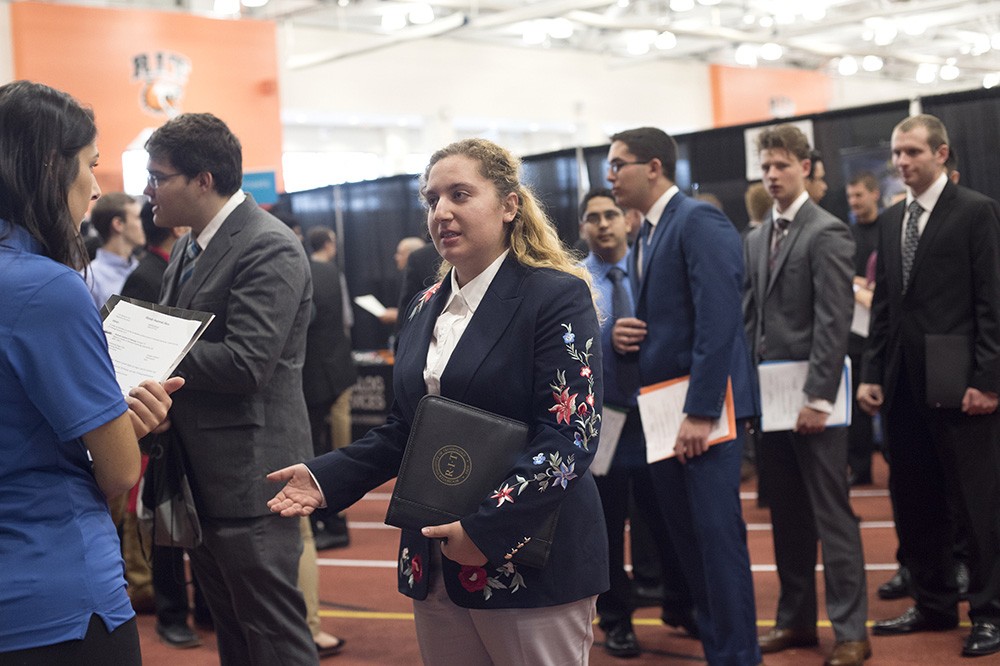 Second-year mechanical engineering student Melody Sadowski-Buca meets with a representative from Advanced Atomization Technologies at the Career Fair. More than 5,000 students and RIT alumni visited with more than 250 employers in the annual Fall Career Fair. -