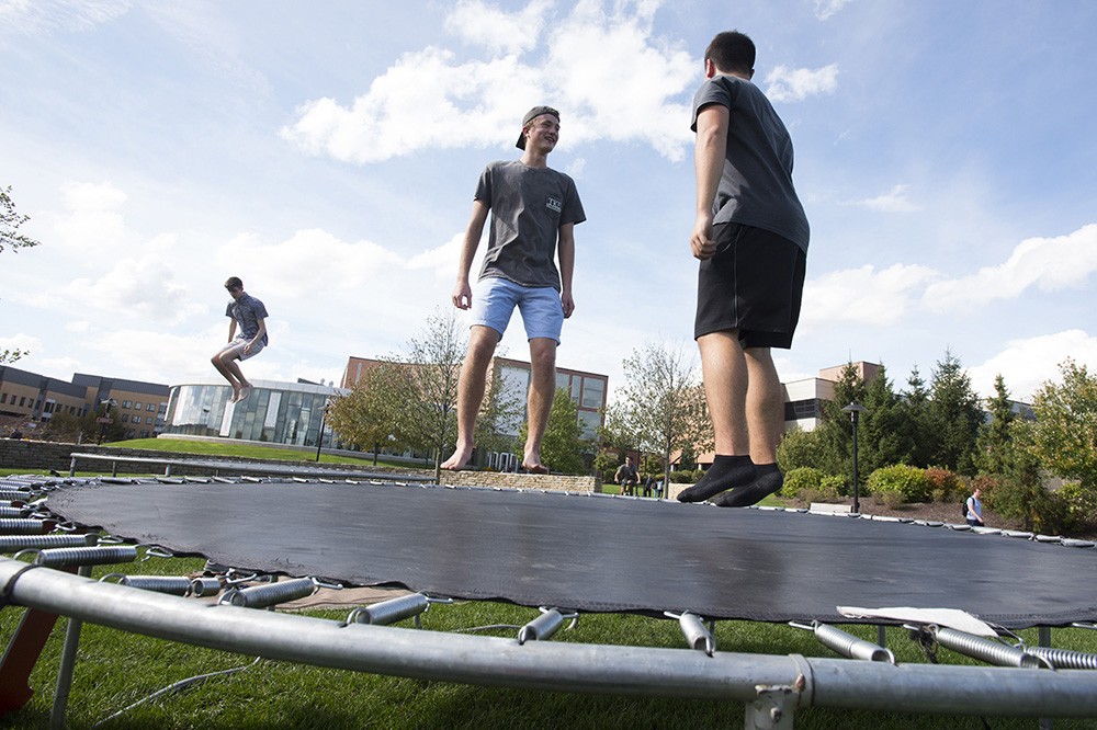 From left, Alex Carpenter, Austin Davis and Nick Bogan kicked-off a fundraiser with a trampoline event. Tau Kappa Epsilon fraternity is fundraising for St. Jude Childrenâs Research Hospital with a 48-hour Jump for Jude. -