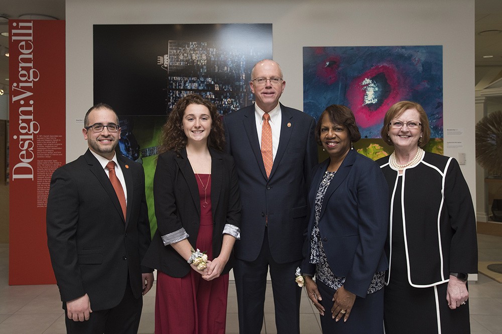 A devoted volunteer to several Rochester charities and nonprofits and a student passionate about global volunteerism received this yearââ¬â¢s Alfred L. Davis Distinguished Public Service Awards on April 12. Twyla Cummings, dean of Graduate Education, received the 2018 Four Presidents Distinguished Public Service Award. Claire Finnerty, a fourth-year biomedical sciences and public policy dual major from Rochester, N.Y., received the 2018 Bruce R. James Award. From left are James Macchiano, selection committee chairperson; Finnerty; RIT President David Munson; Cummings; and Cindee Gray, selection committee chairperson. -