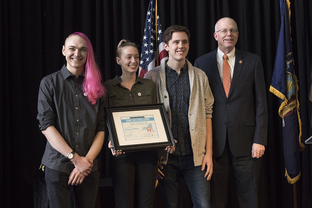 The RIT student team from Aesthetician Labs took first place in the New York State Game Dev Challenge, hosted by RIT and sponsored by Empire State Development, for their game Crazy Platez. From left, Noah Ratcliff, Sam Cammarata and Aidan Markham accepted the $12,000 prize from RIT President David Munson at an event at The Strong in downtown Rochester on April 12. Crazy Platez is described as a high-octane, Rochester-themed game in development that encourages players to race to deliver ââ¬Åplatesââ¬Â to residents and refill tanks before they run out of gas. -