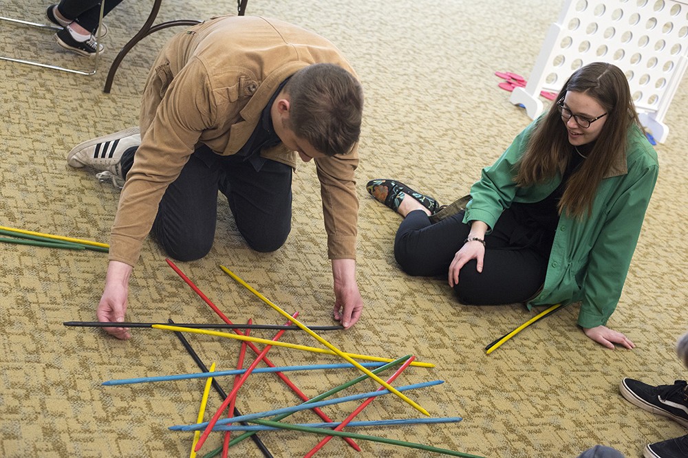 From left, John Pascarella, a third-year new media design student from Boston, Mass., and Quinn Gundel, a fourth-year graphic design student from Buffalo, N.Y., played a game of oversized pickup sticks. RIT College Activities Board hosted a giant board game event in Fireside Lounge that included checkers, Jenga, Uno and Connect Four.