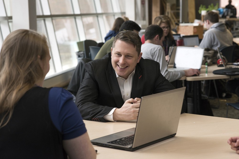 Michael Oshetski ââ¬â¢03 (electrical engineering) talked to students about their senior design projects on a recent tour of campus. Later in the day, he delivered a talk ââ¬ÅSeeing the Light: The Optics of Building a Multi-Million Dollar Companyââ¬Â as part of the Deanââ¬â¢s Speaker Series. -