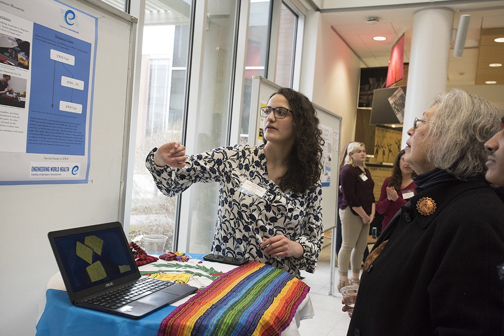 Cristina Guzman-Moumtzis, a second-year student in biomedical engineering and cellular molecular biology from New York City, explains research she conducted while in Antigua, Guatemala. RIT students presented research, work and academic projects they completed while studying abroad at the fourth annual Global Learning Symposium at the University Gallery April 5. International fellowship and scholarship awardees were recognized at the event. -