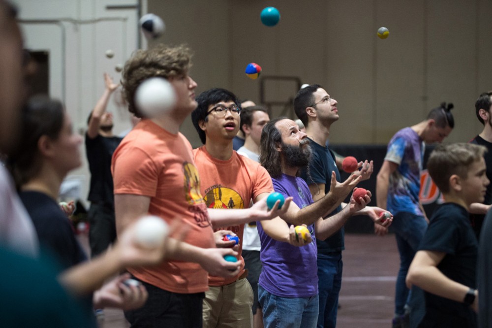 The RIT Juggle-In included workshops and shows in Clark Gym April 6-8. In its 41th year, the event is one of the longest running juggling festivals in North America. Here, participants play ââ¬ÅThree Ball Simon Saysââ¬Â, with some players juggling for the first time. -