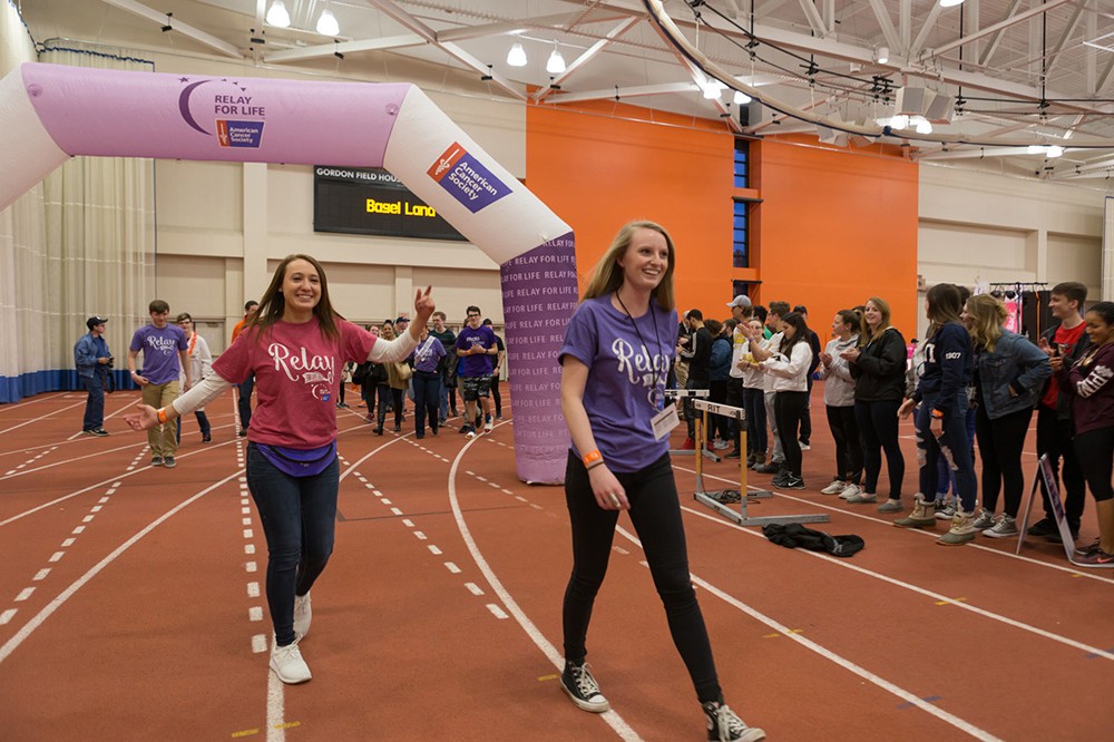 From left, Chloe Hirschfelt, a fourth-year biomedical sciences major from Cheektowaga, N.Y., and Emily Hunt, a fourth-year photojournalism major from Kingston, Mass., kicked off the Relay for Life on April 7. Nearly 800 participants raised more than $83,000 during the 12-hour event in the Gordon Field House. The fundraiser, sponsored by RITââ¬â¢s chapter of Colleges Against Cancer, benefited the American Cancer Society. -
