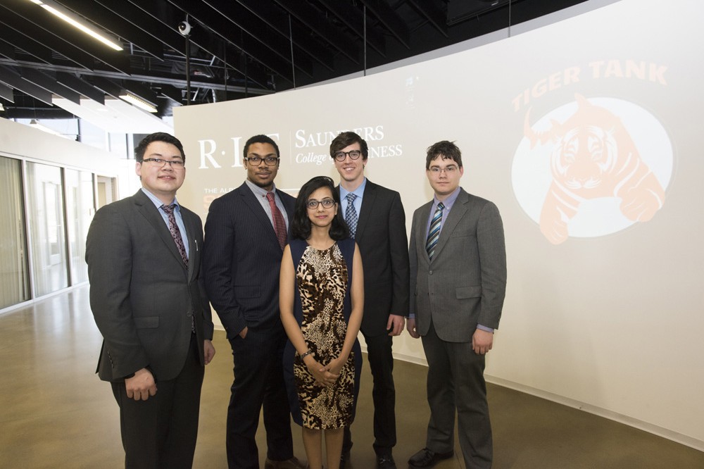 Five teams of RIT student entrepreneurs pitched their business ideas to a panel of Rochester-area investors during the Tiger Tank competition, hosted by the Albert J. Simone Center for Innovation and Entrepreneurship, on April 5. Taking first place was the team from SignSpeak, a communication system for deaf and hearing users that interprets American Sign Language into English and transcribes spoken English conversations when interpreters or captionists are not available. Students, from left to right, are Nicholas Wilkins, a third-year computational mathematics student; Michael Johnson, a third-year mechanical engineering student; Priyanka Patil, a first-year computer science student; Caleb Kellicutt, a third-year computation mathematics student; and Nikolas Kelly, a second-year industrial systems and engineering student. More than 60 proposals were submitted for the chance to win $4,750 in cash prizes as well as scholarships for graduate studies at RITââ¬â¢s Saunders College of Business. -