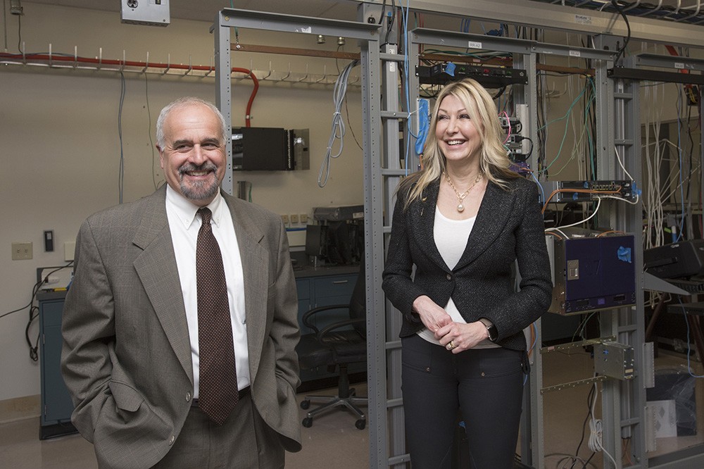 Telecommunications engineering technology professor Mark Indelicato and REDCOM President & CEO Dinah Gueldenfennig Weisberg were among the group celebrating a recent equipment donation to the REDCOM Advanced Telecommunications System Laboratory in CAST. The company has been a long time partner of RIT and CAST, providing resources for student coursework and faculty research in the telecommunications field. -