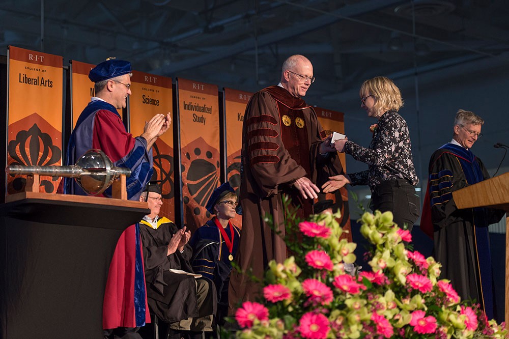RIT President David Munson acknowledges Kathryn Gardner during the 2018 Outstanding Undergraduate Scholars award ceremony on March 22. Since 1976, RIT has honored the top 1% of undergraduate students that are able to maintain a high standard of academic excellence while also giving back to their community through civic or volunteer work, conducting research, or being engaged in co-op or work in their field of study. For more information, go to https://www.rit.edu/academicaffairs/outstanding-undergraduate-scholars/overview -
