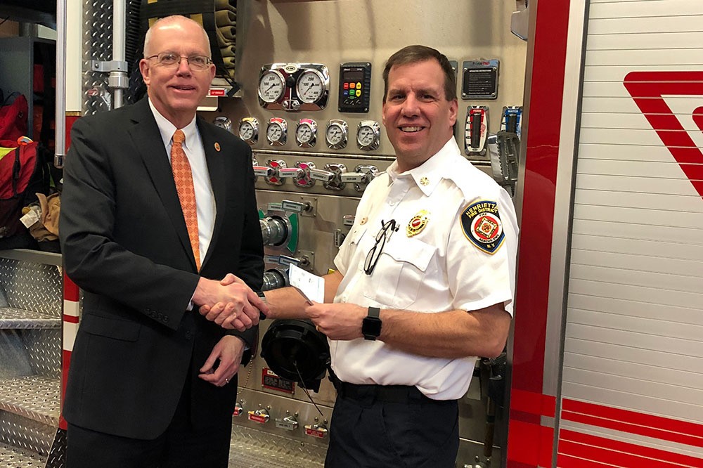 RIT President David Munson presents Mark Strzyzynski, chief of the Henrietta Fire District, with a check for providing fire protection service to the campus. The university’s voluntary contribution included $35,000 to support the district’s annual operating budget and $40,000 to assist in the purchase of a new ladder firetruck. The Henrietta Fire District is responsible for protection of the 1,300-acre RIT campus. -