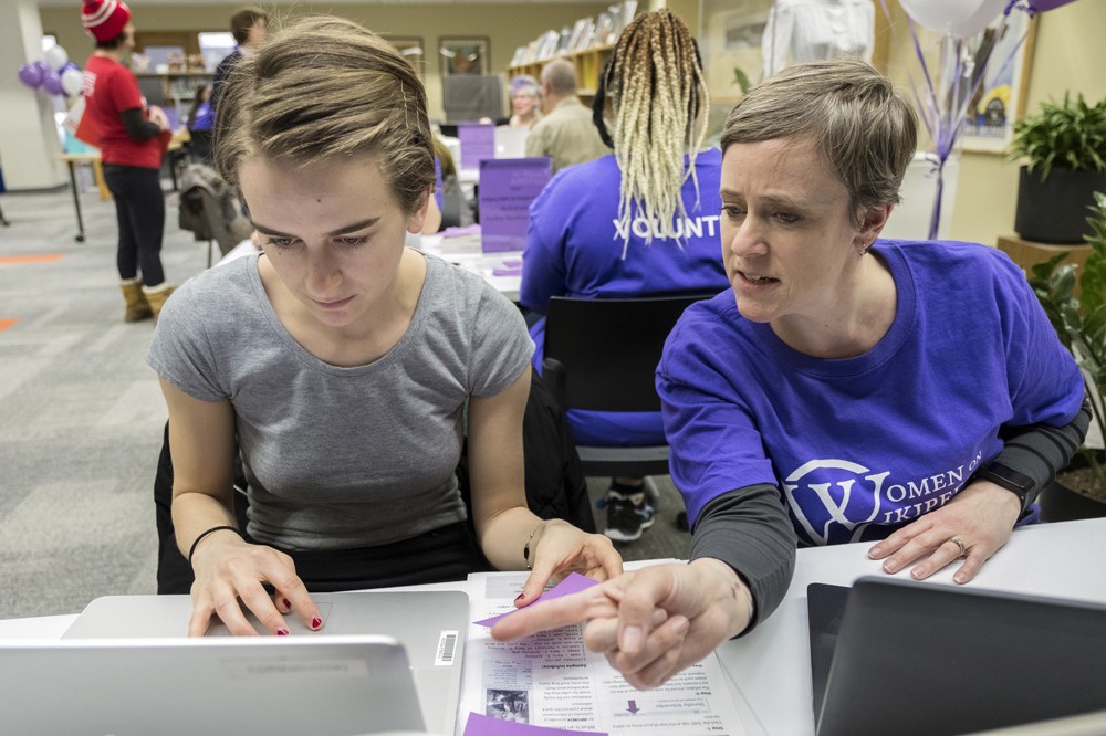 Hana Halilaj, left, a School of Individualized Study student from Kosovo, receives help from Wendy Way, a librarian participating in the Women on Wikipedia event March 24. Volunteers edited and increased entries about significant women and events related to women by writing new posts. -