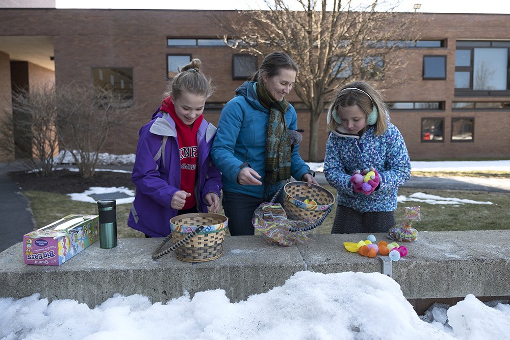 From left, Siobhain, BrÃÂd (associate professor in economics) and Ellis Hanna sort their eggs and prizes at RITââ¬â¢s annual Easter Egg Hunt on March 24. Hundreds of candy-filled eggs were scattered across the Gleason Quad for children to find and put in their baskets. The event is sponsored by the students of RIT Art House. -
