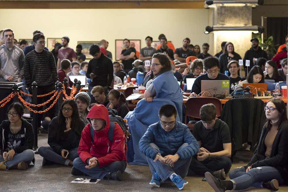 Ransom Quinn, center, a fifth-year computer engineering major at RIT from Fayetteville, N.C., is wrapped in a Datto blanket at the welcome talks for BrickHack4, RITââ¬â¢s premier hackathon. Datto, one of the sponsors, was founded by Austin McChord, a 2009 RIT alumnus. Hundreds of students from around the country gathered to create a product over a 24-hour period.