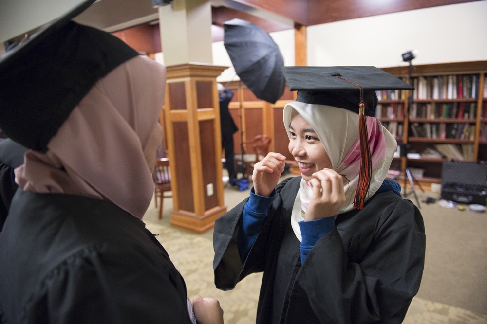 From left, Irma Kamaruddin and Noor Masleina Dahalan, fourth-year biotechnology students from Malaysia, help each other adjust their caps before getting their portraits taken by GradImages at the graduation fair. About 500 members of RITââ¬â¢s Class of 2018 attended a graduation fair in the Student Alumni Union. The fair provided students with a one-stop opportunity to gather information related to the May 11-12 commencement weekend. -