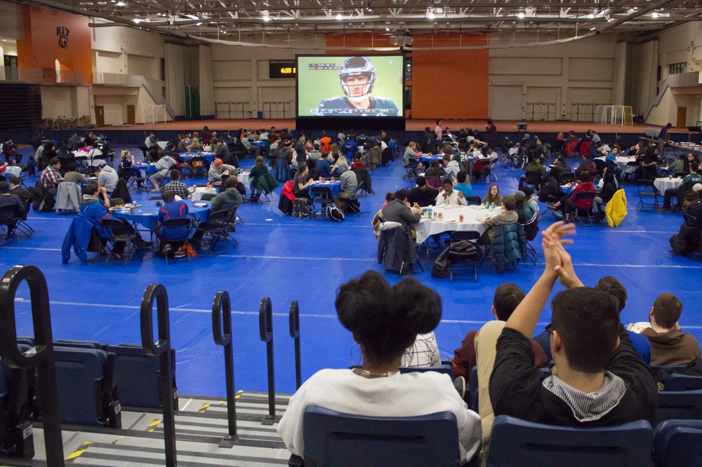 RIT’s College Activities Board hosted its annual Super Bowl party in the Gordon Field House on Feb. 4. The game was projected and captioned on a giant screen. The free event included pizzas, wings, prizes and giveaways. -