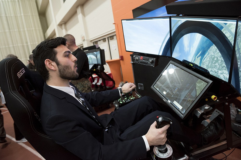 Ian Kurtz, a fourth-year mechanical engineering major from Douglassville, Pa., tested a flight simulator at the US Marine Corps Officer Programs set-up at RITââ¬â¢s 2018 Spring Career Fair on Feb. 7. More than 230 companies searching for skilled employees attended the fair, and more than 5,000 students and alumni were expected. -