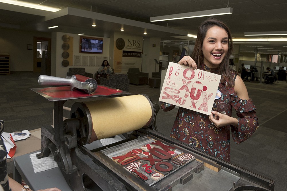 Isha Mehta, a second-year graphic design student from Baltimore, Md., shows off the Valentine she printed with a handpress in Wallace Library. Letterpress printing presses and button presses were set-up to create your own Valentine on paper, a button or a magnet. -