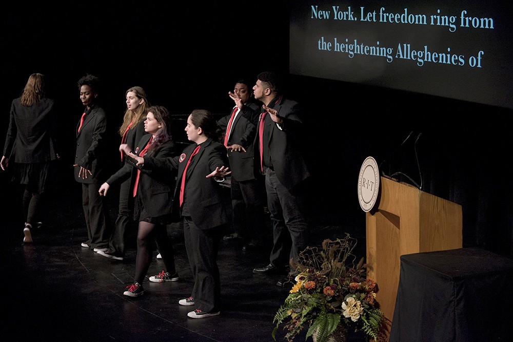 Performance group Dangerous Signs performed at the Let Freedom Ring: Commemorating Dr. Martin Luther King, Jr. celebration today. RIT students, faculty and staff assembled in Ingle Auditorium for a program honoring Kingââ¬â¢s life and work on his birthday. Next Thursday, Jan. 25, RIT will host the 36th annual Expressions of Kingââ¬â¢s Legacy celebration, featuring BET News host and CNN political contributor Marc Lamont Hill as keynote speaker, with additional performances by Rochester soul band Danielle Ponder and the Tomorrow People and poet Reenah Golden.