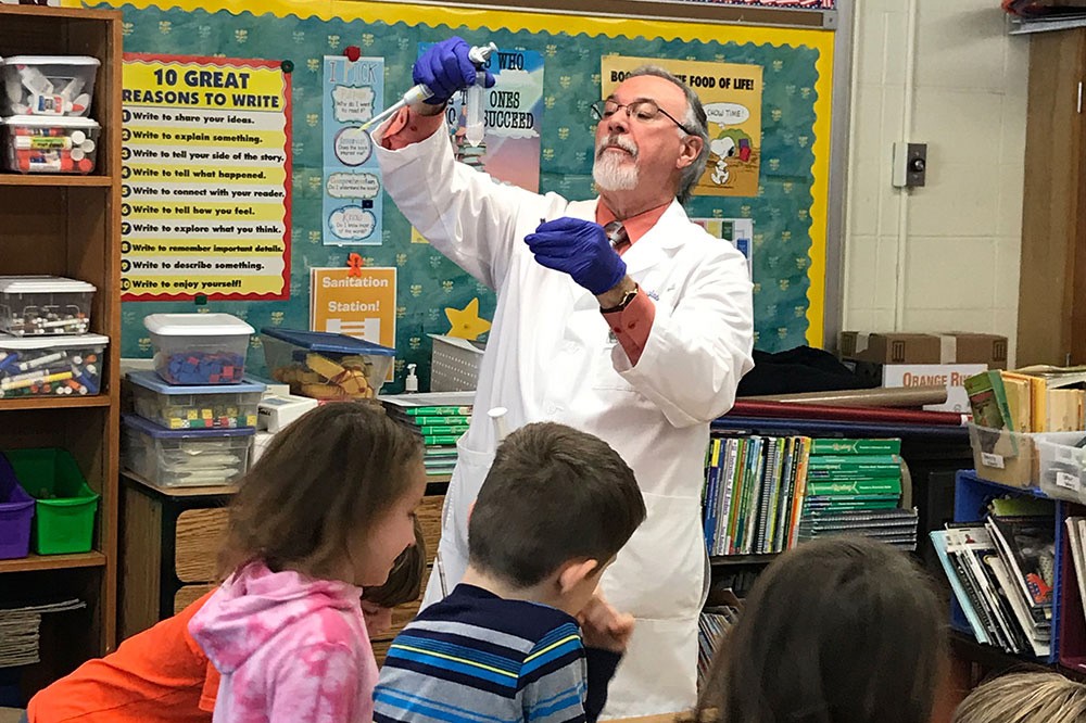 RIT professors from the College of Health Sciences and Technology gave third-graders a glimpse of the field of biomedical sciences during a visit to the Park Road School in the Pittsford Central School District on Jan. 10. Biomedical sciences professors Douglas Merrill, above, and Robert Osgood gave 75 students a crash course in DNA. Merrill, Osgood and Tamra Werner, CHST alumni director, worked with the students to extract and isolate strands of their genetic code in tiny glass pendants. Osgoodââ¬â¢s DNA necklace exhibit is a perennial favorite at the Imagine RIT: Innovation and Creativity Festival, held this year on April 28. -
