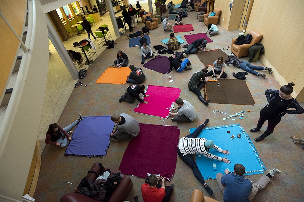 Approximately 130 Residence Life advisers made blankets as a volunteer activity Jan. 15. The completed blankets were delivered to the Willow Domestic Violence Center and CURE Childhood Cancer Association. -