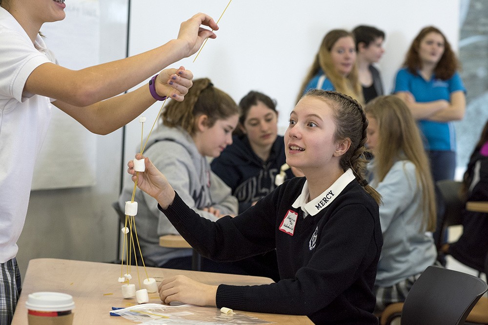 Our Lady of Mercy School for Young Women eighth-grader Maggie Bauman works on the marshmallow tower challenge with a partner at an event in the MAGIC Center. Two-hundred young women from Mercy in Rochester visited RIT Jan. 17 for a daylong enrichment experience. The girls were able to design video games in the MAGIC Center lab, learn about engineering models and conduct simple science experiments. They also toured campus and were able to ask questions to RIT female students studying in these areas. The day was sponsored by RITââ¬â¢s MAGIC Center and University Center for Engaging K-12. -