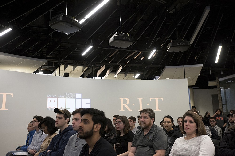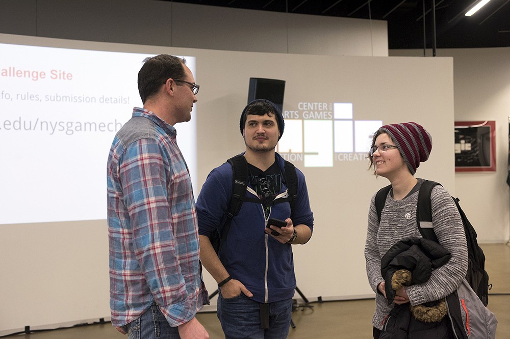 From left, Michael Bukowski from New York-based game development studio Vicarious Visions talks with fourth-year game design and development students Matthew Schweigardt, from Queensbury, N.Y., and Jeannette Forbes, from Loudoun, Va., after the Game Dev Challenge kick-off on Jan. 19. RITââ¬â¢s MAGIC Center is hosting its second annual New York state Game Dev Challenge, an opportunity for students enrolled in New York state colleges and universities and indie developers residing within the state to bring their game ideas to production. Winners in two categories will be awarded up to $25,000 in funding to aid in the development and production of their game; will be included in an on-site incubator at RIT, New York University or Rensselaer Polytechnic Institute for up to one year; and will have access to a mentor network. Entrants will be judged on their game idea pitch, game prototype, business plan, mentorship plan and development timeline. The challenge officially launched Jan. 1, with submissions being accepted until March 1. Winners will be announced at a ceremony at The Strong National Museum of Play on April 12. -