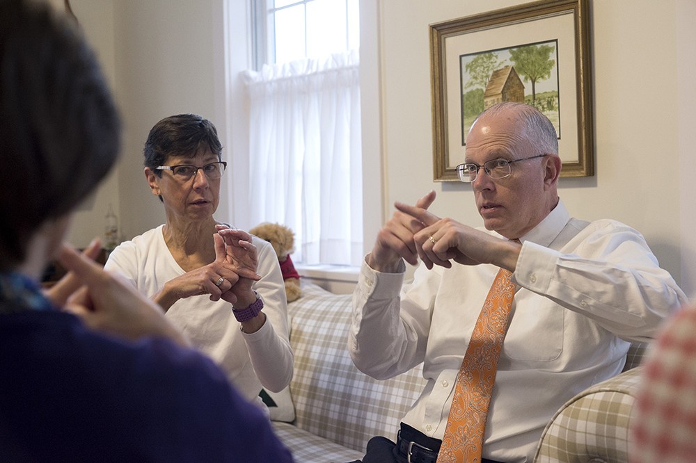 RIT President David Munson and his wife, Nancy, have a weekly American Sign Language lesson from Jeanne Behm, the coordinator of the RIT ASL and Deaf Studies Community Center, at Liberty Hill. -