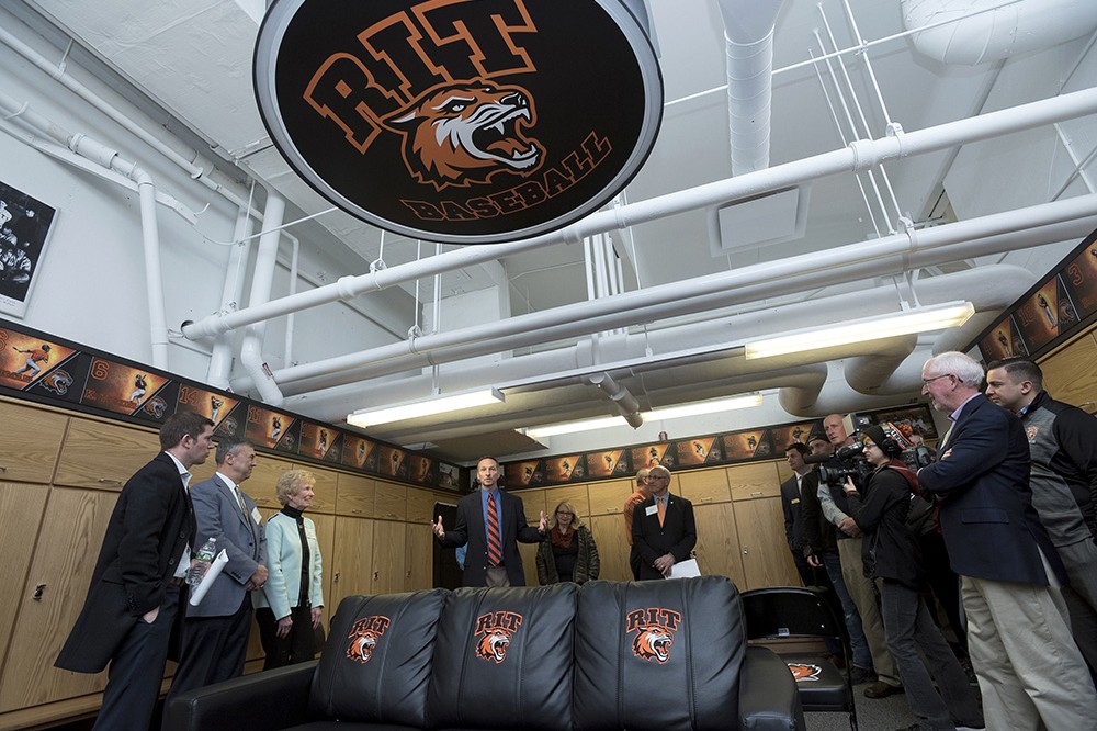 RIT Baseball head coach Rob Grow ‘88, shows off the new baseball locker room. The room was renovated thanks to the generous donations of Jan Proper-Shrier, in honor of her husband former RIT baseball coach Bruce Proper, and the Hern Family, in honor of former Tiger player Tim Hern ‘00. Both Proper and Hern are members of the RIT Sports Hall of Fame. -