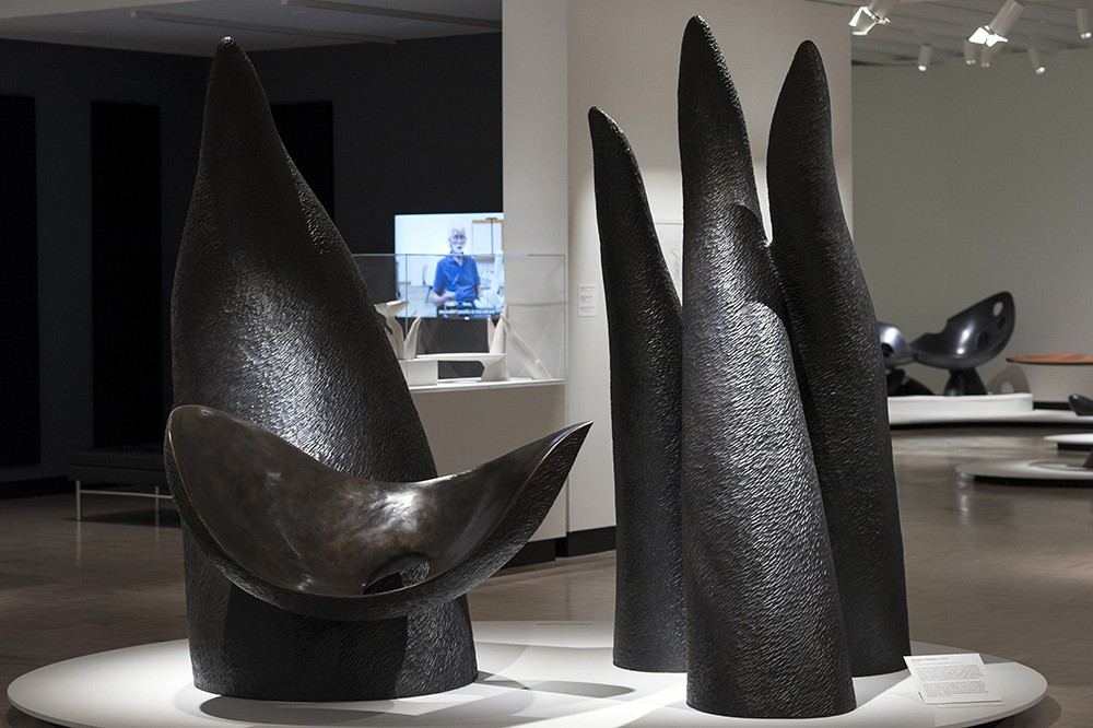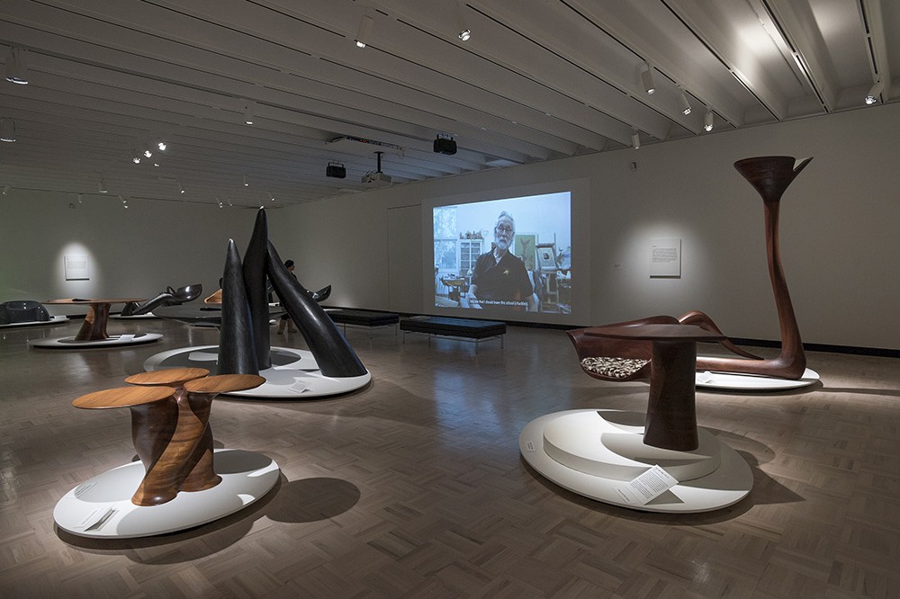 RIT Artist-in-Residence Wendell Castle is celebrated with an exhibition at the Memorial Art Gallery through Dec. 31, 2017. “Wendell Castle Remastered” features nearly 40 works, including early examples of his stack-lamination technique, mold-form fiberglass, bronze sculptural forms and new work using his state-of-the-art robot. Castle is shown on the screen in the background, from a film about the artist that plays continuously. -