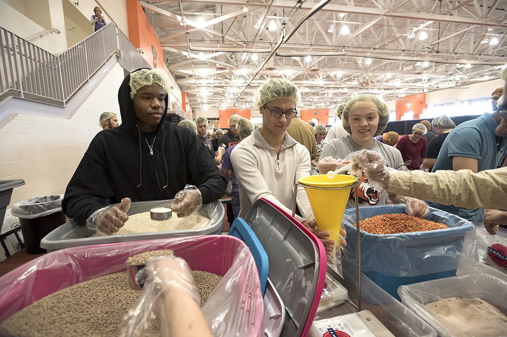 From left, Killiaun Blatche, a first-year computing exploration student from Syracuse, N.Y., Ian Strszeck, a first- year computing security student from Rochester, N.Y., and Hannah Chew, a first-year computing exploration student from Ellicottville, N.Y., participated in the assembly of meals for the Hunger Project. RIT students prepared over 20,000 meals for the community during the Giving Tuesday Hunger Project in the Gordon Field House. The project was coordinated by the Center for Leadership & Civic Engagement. 2,000 of the meals will be donated to RITââ¬â¢s FoodShare program and the remaining over 18,000 will be donated to Foodlink in Rochester. -