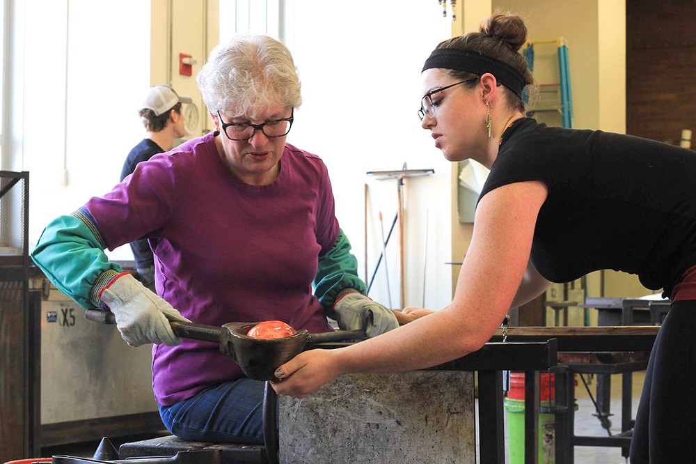 Second-year College of Imaging Arts and Sciences glass student Rachel Strittmatter from Harrisburg, Pa. (right) and Susan Ackerman, RITââ¬â¢s director of disability services, created a glass paperweight as part of a fundraiser for an upcoming glass conference in Murano, Italy. The two-day fundraiser offered instruction in making a paperweight in the hot shop or a glass pendant in the flame shop. -
