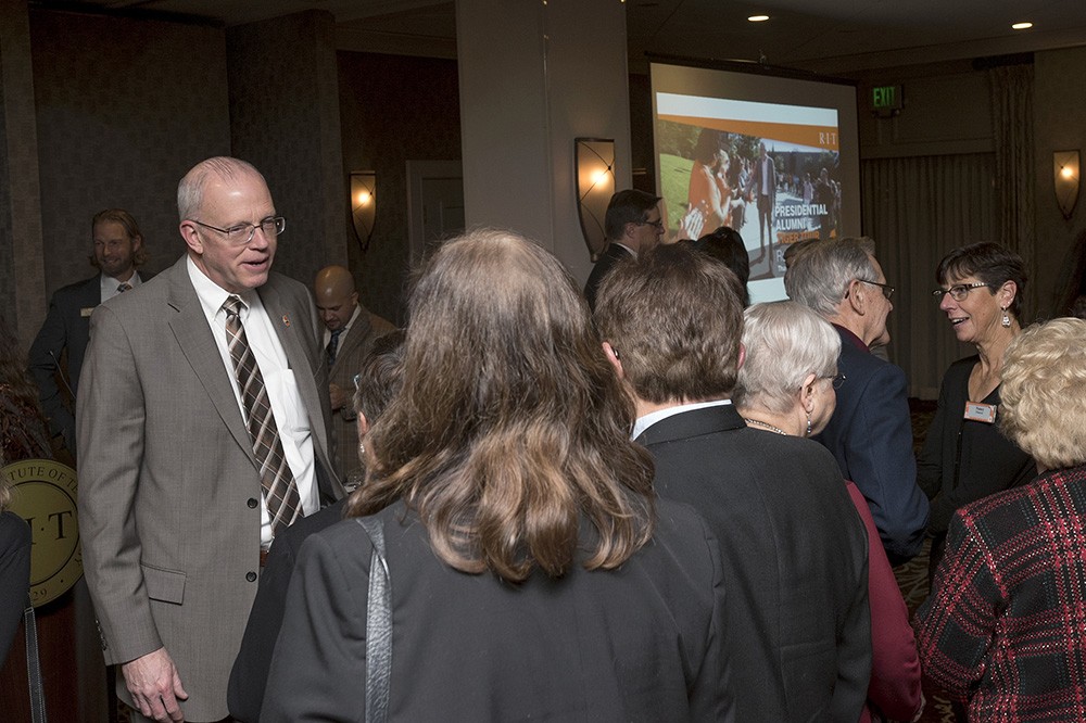 RIT President David Munson talks with Rochester area alumni on Dec. 7 as part of the Presidential Alumni Tiger Tour. RIT alumni chapters around the country are hosting receptions to welcome Munson to the RIT family. -