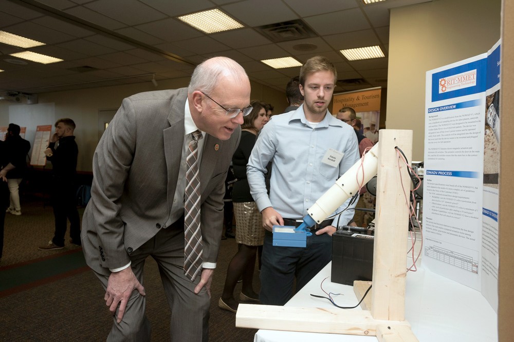 Dakota Marshall, a third-year mechanical engineering technology student, describes the design process for NOMAD VI, a prototype electric arm that could be used for acquiring meteorite samples, to RIT President David Munson. He was one of the students and faculty from CAST who were part of the inaugural Applied Critical Thinking and Learning Showcase Dec. 7. On display were student design projects and faculty curricula highlighting how applied critical thinking is being integrated into coursework from packaging science, manufacturing and mechanical engineering technology and hospitality. -