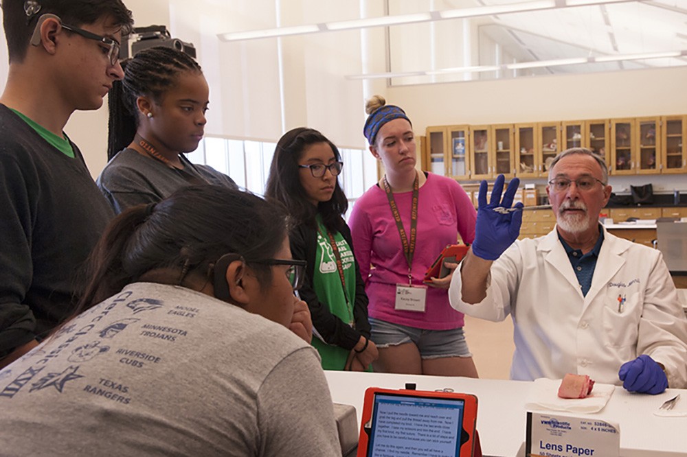 Douglas Merrill, professor of biomedical sciences, introduces students to the art of suturing during NTIDâs Health Care Careers Exploration Camp. The camp offers students from all over the United States the opportunity to sample future careers in health care.