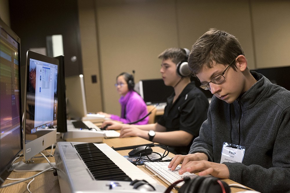 Peter Cetner, a 10th grader at Brighton High School, works at a digital audio workstation in the Electronic Dance Music Production class, one of the offerings in RITâs Kids on Campus summer program. The in-depth workshop covers composing, editing, mixing, arranging and more. -