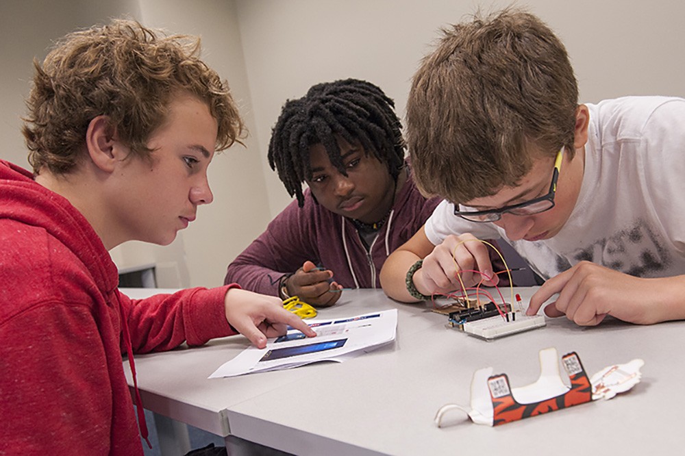 At NTIDâs TechBoyz camp, from left, Ethan Lippold, Gavin Laurore and Travin Nipper make a switch out of available materialsâwhich can be something as simple as a clothespin. The camp caters to boys interested in careers in Science, Technology, Engineering and Math (STEM). -