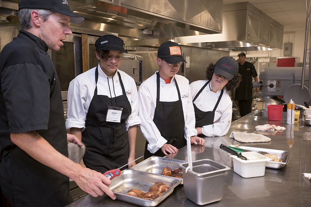 From left, Eric Mercovich, a sous chef at RIT, instructs high schoolers Jayna Walker, Sam Frank and Savannah Domenech in some cooking techniques in the Restaurant Management Experience class during RITâs Kids on Campus summer program. The students had the opportunity to work in a commercial kitchen, learning kitchen safety, menu planning, nutrition and budgeting. -