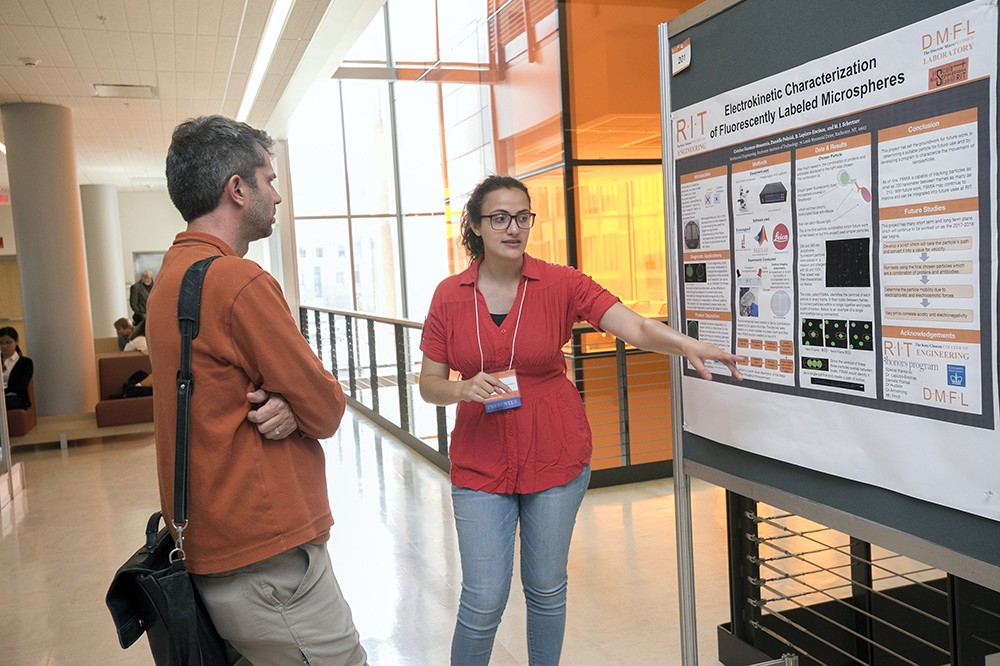 Cristina Guzman-Moumtzis, a second-year student in biomedical engineering and cellular molecular biology from New York City, N.Y., explains her research to Steven Day, associate professor in the Kate Gleason College of Engineering. RIT students from a variety of colleges and disciplines presented their research at the 26th annual Undergraduate Student Research Symposium on campus Aug. 4. More than 250 student projects were presented by students and their faculty mentors. -